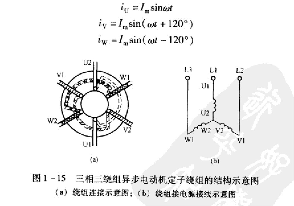 异步电动机的转子要转动起来,就必须有旋转磁场。当然,实际的异步电动机中的旋转磁场,不会像图I一13中表示的那样由外力拖动,而是把电动机的定子绕组接到三相电源上,利用绕组中的对称三相电流获得的。当异步电动机定子三相绕组中通入三相电流时、在气隙中就产生了一个旋转磁场,所谓旋转磁场就是按一定规律分布并围绕着一个轴在空间不断旋转的一个磁场。为了说明旋转磁场的产生过程,以一个三相三绕组异步电动机来分析一下。图I一15是三相三绕组异步电动机定子绕组的结构示意图。三相绕组U1-U2, VI-V2, W1-W2在空间相差1200。把3个绕组接成星形,并接到三相电源L,这样电动机绕组中就有了三相电流。图I一16是三相交流电的波形图。三相交流电的表达式为