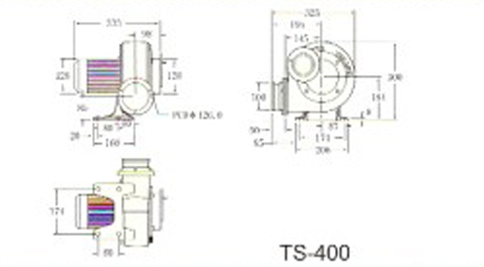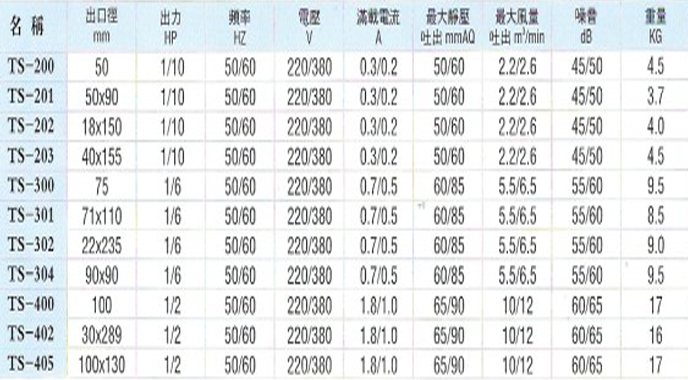 TS200-400鼓风机◆小型·重量·轻高风压◆前顷式叶片设计,体积小、质量轻且较有高压力之产生。低噪音◆新设计,能消除切风时产生之高频及特殊之消音材质,大幅降低噪音比。低震动◆叶片均经过电脑平衡校正与高精密的机械加工,使震动降到最低。◆TS系列抽风机风压范畴:480Pa 900Pa(90 mmH2O)